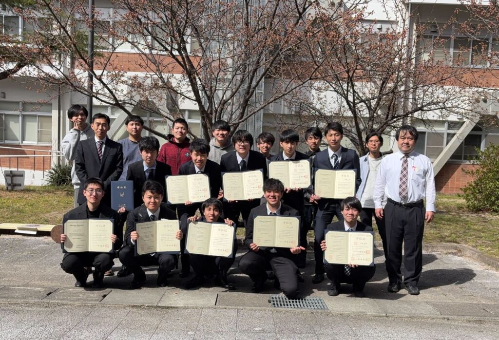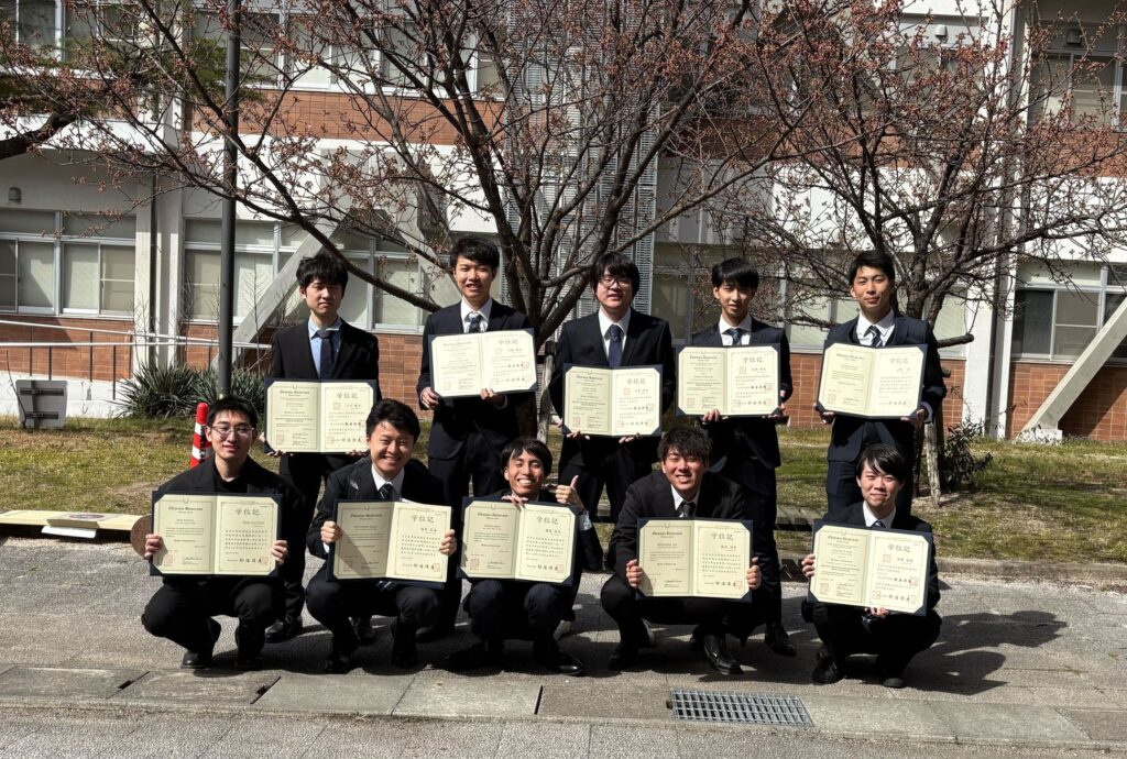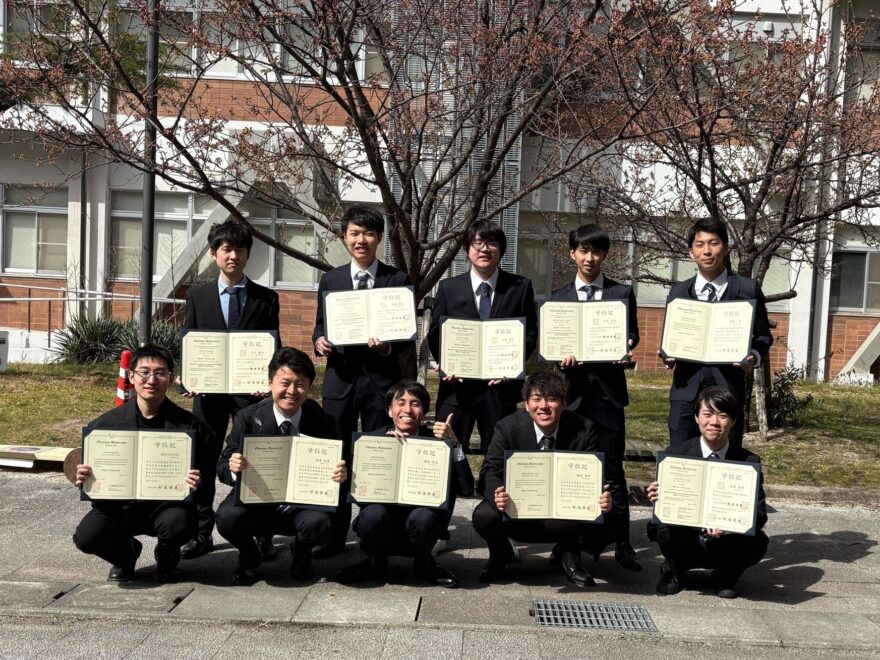 研究室の修了生は5名,卒業生は5名です.岡山大学の渡邊研究室で修了生,卒業生を送り出すのは4回目ということになります.今年は桜が咲くのが遅かったため,3号館の前で学位記とともに記念撮影をしました.