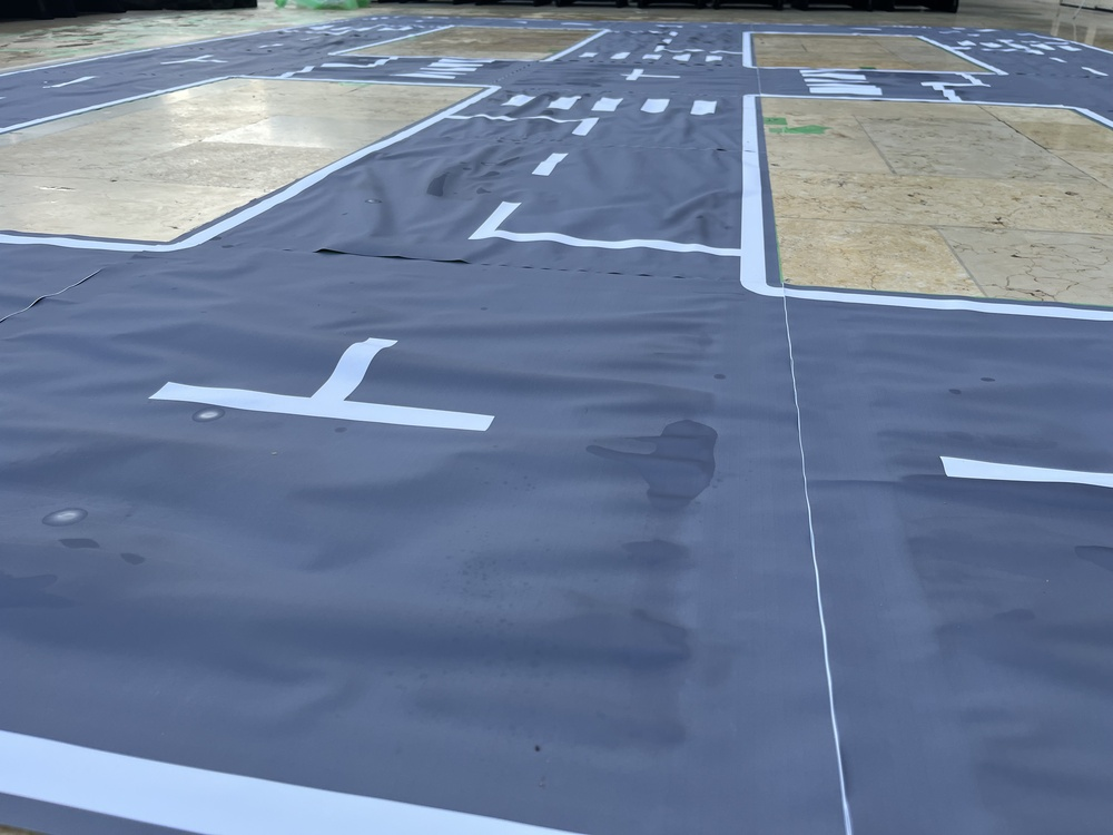 朝、会場に行くとまた道路が濡れていて、カバーをかけていたのにヨレヨレに…。 予備の道路に張り替えて対応しました。