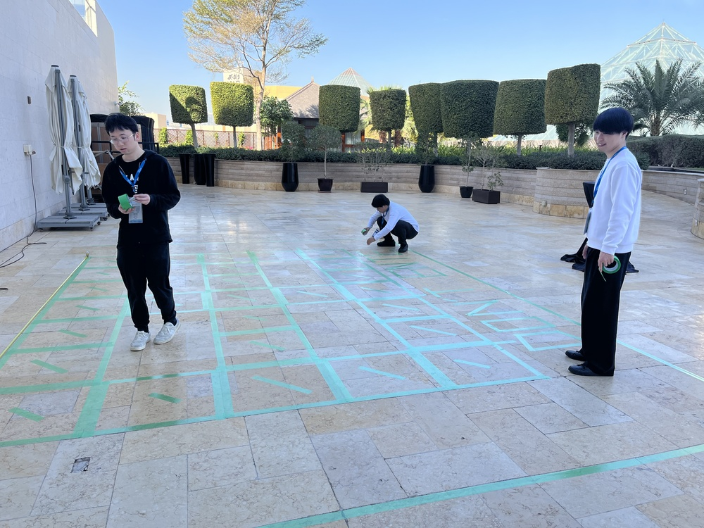 到着後は早速、屋外でDesign Contestのコース設営を行いました。 しかし、朝露で床が濡れていて大変でした…ホテルの人に拭いてもらいました。